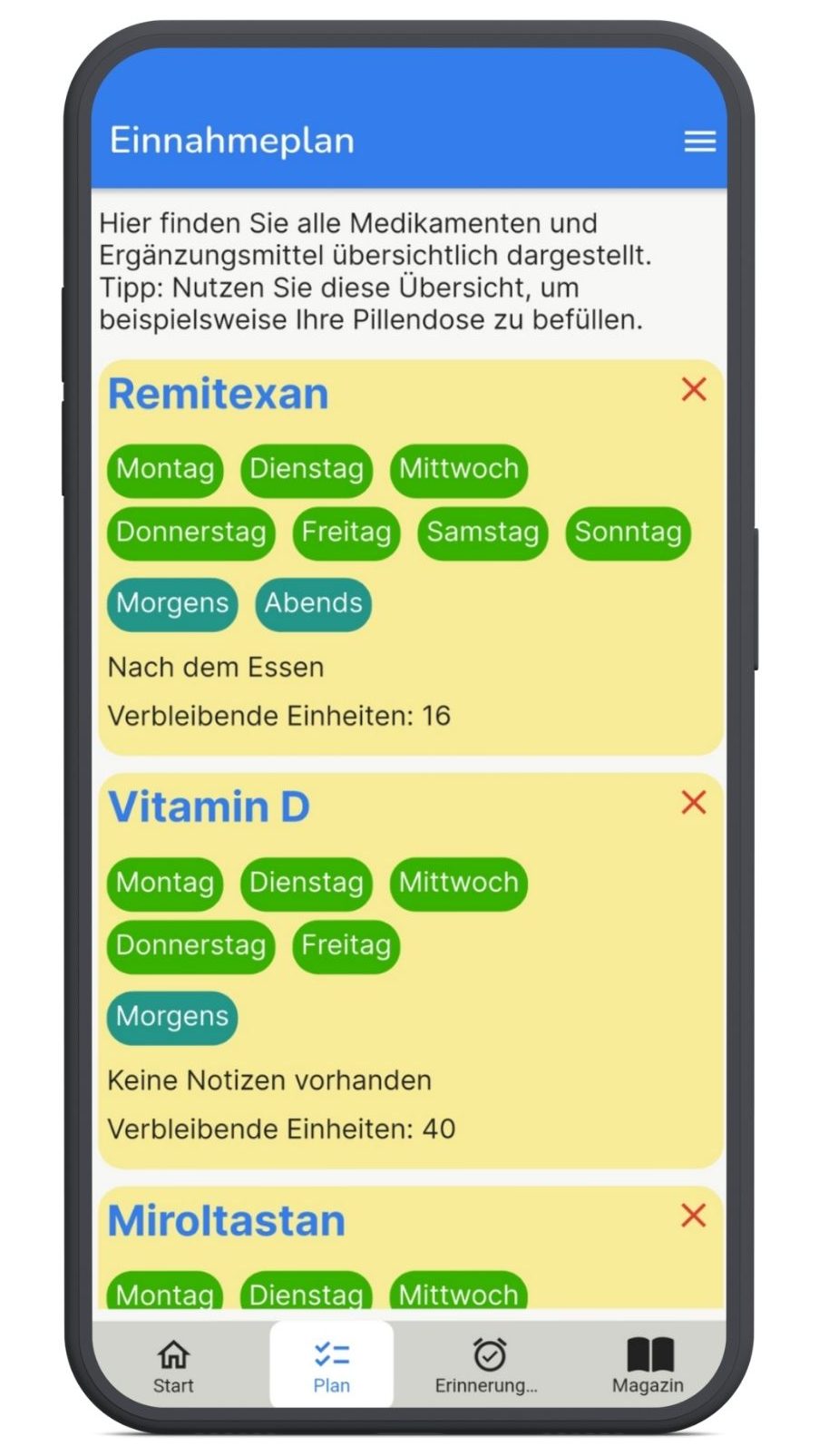 Zentrale Funktion ist der Einnahmeplan: Beliebig viele Präparate können dort angelegt und verwaltet werden. Sofort ist ersichtlich, an welchem Wochentag und zu welcher Tageszeit die Einnahme erfolgen muss. Bei Fälligkeit wird dann eine entsprechende Push-Notifikation auf das Smartphone geschickt - auch wenn die App gerade nicht geöffnet ist.