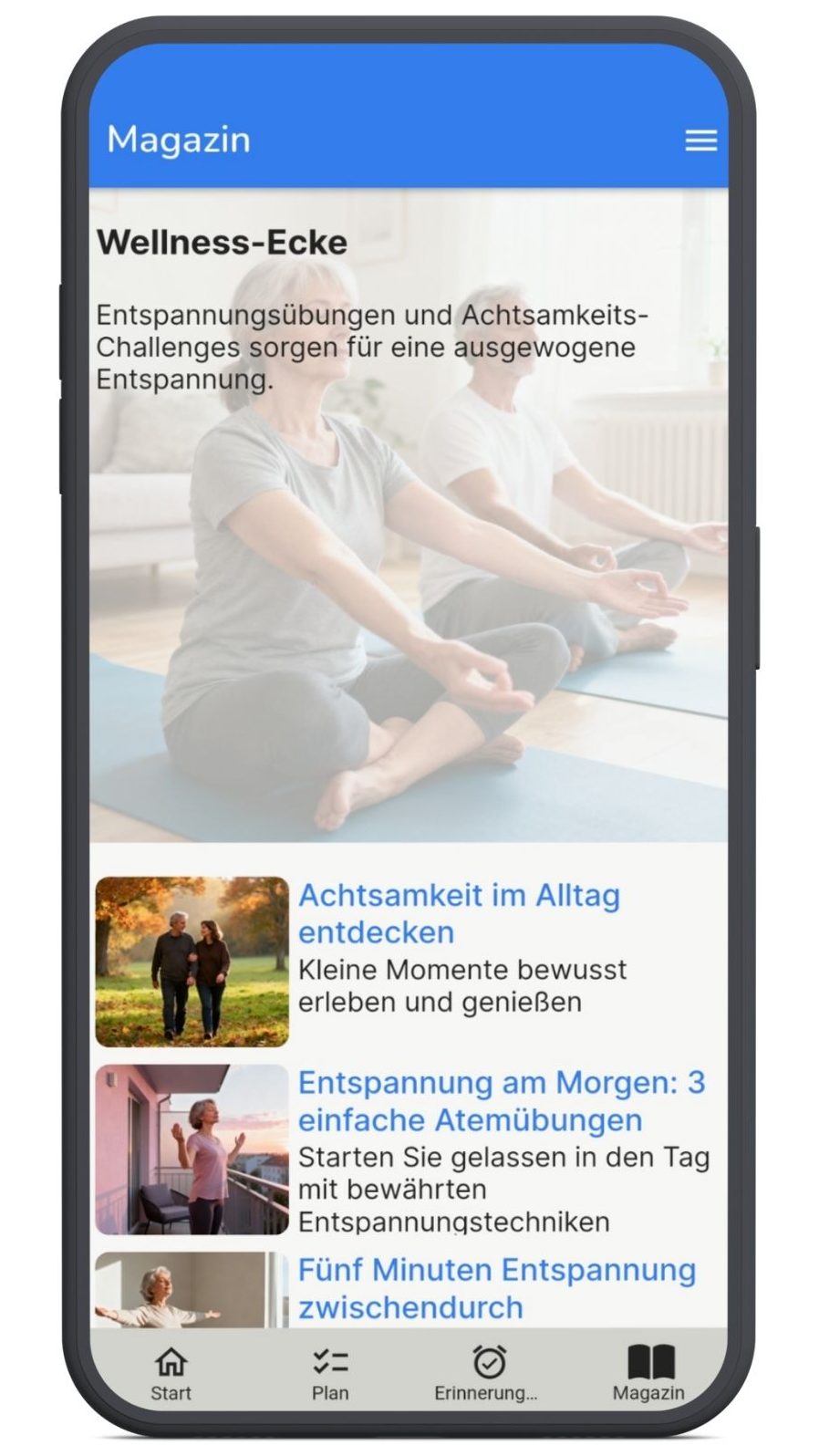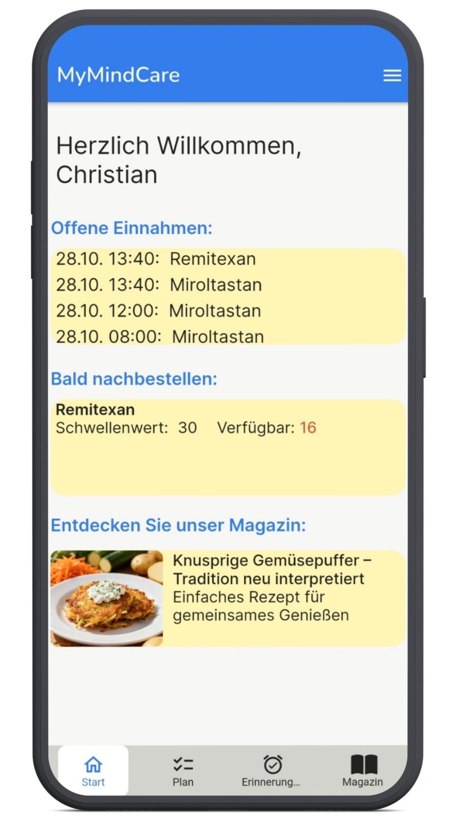 MyMindCare unterstützt zuverlässig dabei, die Einnahme von Medikamenten und Nahrungsergänzungsmitteln nicht zu vergessen. Präparate lassen sich einfach in einem übersichtlichen Plan organisieren und über rechtzeitige Push-Benachrichtigungen wird an die Einnahme erinnert. Die intuitive und leicht verständliche Bedienoberfläche ermöglicht einen komfortablen Einstieg. Ergänzt wird das Angebot durch ein integriertes Magazin, das mit abwechslungsreichen Artikeln für neue Wohlfühlmomente im Alltag sorgt – sei es mit entspannenden Übungen oder inspirierenden Rezeptideen.